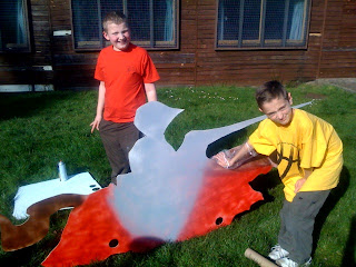 Almost complete. The boys turned up on a sunny Saturday afternoon to put the finishing touches to the horse. They loved spray painting - it was almost as if they'd done it before some place else.. !?